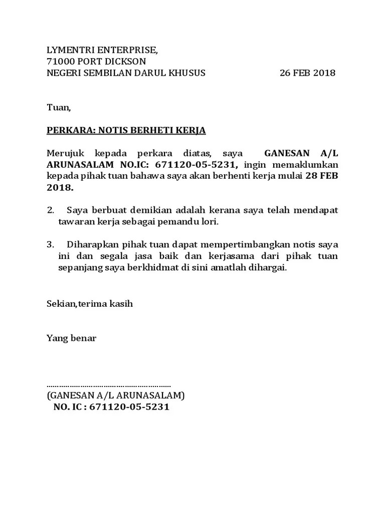 Operator kilang surat resign 24 jam. Operator kilang cara nak buat surat berhenti kerja. Notis berhenti kerja 24 jam bahasa melayu. You just have to click on the gallery below the contoh surat perletakan jawatan operator kilang picture. Maka, dalam surat ini, kita akan tetap gunakan nama syarikat. Contoh surat perletakan jawatan notis seminggu.