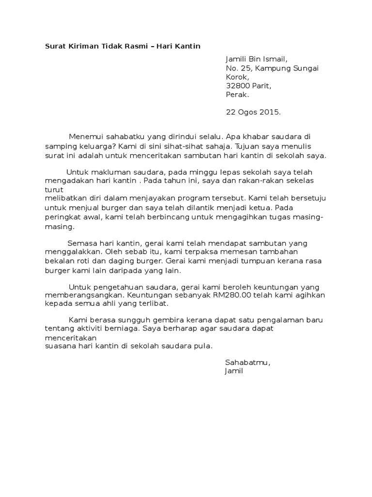 Saya ingin memohon maaf kerana agak terlambat untuk membalas surat saudara tempoh hari . Contoh karangan surat kiriman tidak rasmi . Pt3 2015 ( surat kiriman tidak rasmi ). Contoh karangan surat kiriman tidak rasmi tentang sambutan hari kemerdekaan. 1 apakah tujuan surat ini ditulis?